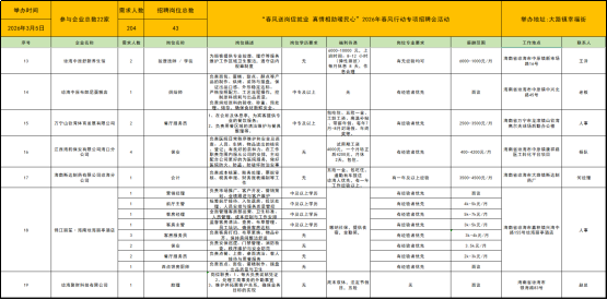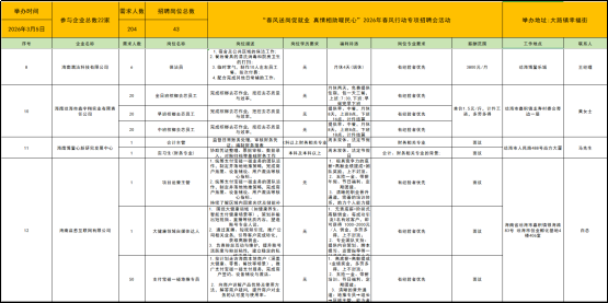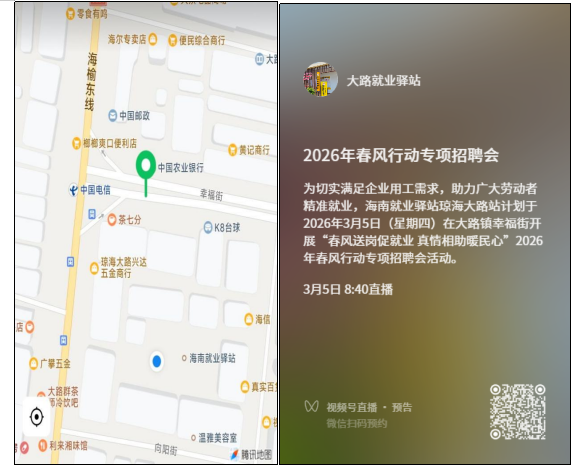 为深入贯彻落实稳就业、保就业工作部署,扎实开展2026 年春风行动暨就业援助月专项服务活动,切实满足企业用工需求,助力广大劳动者就业,海南就业驿站琼海大路站计划于2026年3月5日(星期四)在大路镇幸福街开展“春风送岗促就业 真情相助暖民心”2026年春风行动专项招聘会活动,为企业、重点群体就业以及广大求职者搭建供需对接平台,全力护航春节后就业市场平稳有序,以实际行动暖民心、惠民生、促发展。